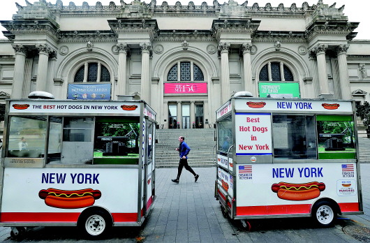 美国纽约曼哈顿大都会博物馆外停放的热狗售卖车。  新华社发