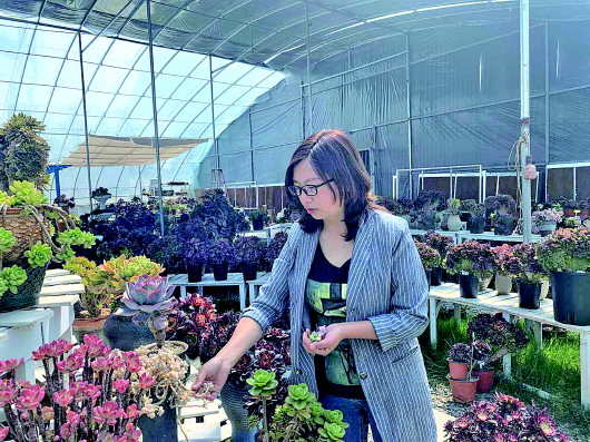 在龚华丽的“多肉花园”里,一株株可爱的多肉植物有序摆放着。龚华丽说,“我们棚里的多肉品种越来越多,现在有近2000个品种。”