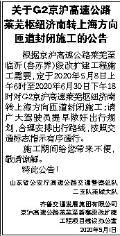 根据京沪高速公路莱芜至临沂(鲁苏界)段改扩建工程施工需要,定于2020年5月8日上午6时至2020年6月30日下午18时对G2京沪高速莱芜枢纽济南转上海方向匝道封闭施工;请广大驾驶员提早做好出行规划,合理安排出行路线,按照交通标志指示有序通行。