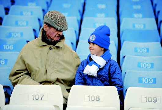 一名切尔西小球迷在爷爷的陪伴下看球。从小培养对自己俱乐部的热爱,是英国足球文化的特点之一。 IC photo