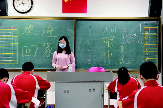 5月8日,济南二十七中初三同学返校复课,分A、B班,每班不超过20人,座位之间相隔1米。黑板上,“千言万语请用眼神交流”的提示格外显眼。 当天,济南249所初中开学复课,82860名毕业年级学生、17179名教职工返校。开学第一课,着重讲“防疫”,不少学生收到健康礼包。 截至5月8日,山东已有11市初中毕业年级复课。菏泽、临沂、济宁、东营、滨州初中毕业年级今明两天也将陆续开学。 齐鲁晚报·齐鲁壹点记者 王媛 摄