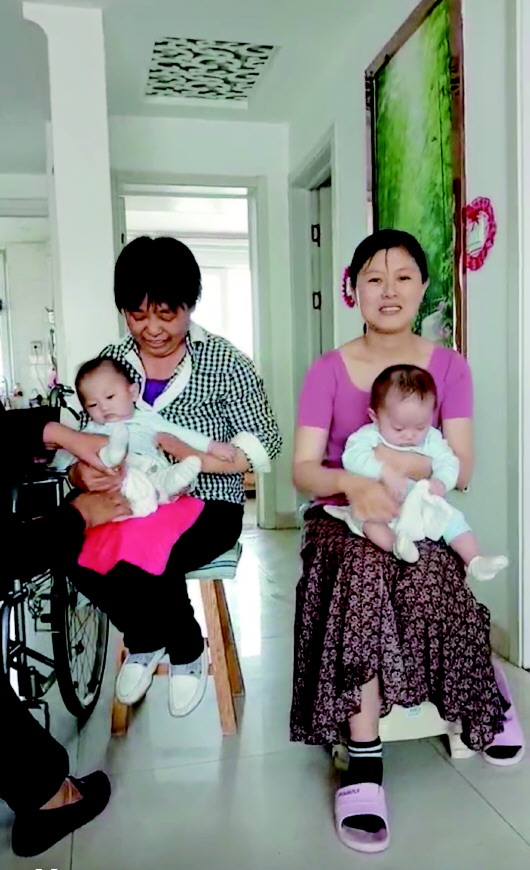 ◤49岁的刘玉珍和28岁的儿媳张秀秀分别抱着龙凤胎。