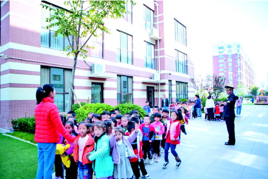 安保人员悉心护卫放学的孩子们。