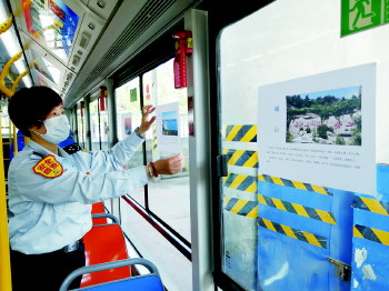 栈桥、五四广场统统搬进公交车厢……今年的5月19日是第十个“中国旅游日”,公交市北巴士第二分公司30路驾驶员戴翠红将她的车厢布置一新:她将青岛极具特色和象征性的景点地标的照片打印出来,并附上简短的简介张贴在车厢中,供乘客欣赏。