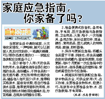 4、根据实际情况装配应急箱。家中物品齐全,可供全家用1天。在工作地,主要准备食物和水,轻便小巧。私家车中主要准备食物、水、医疗急救箱、手电筒等。