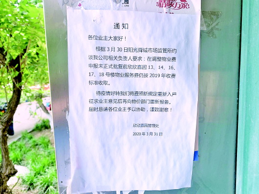 在中五区17、18号等多栋楼的单元楼门前都张贴着一则《通知》。该《通知》上写道,“根据3月30日阳光舜城市场监管所约谈我公司相关负责人要求:在调整物业费申报未正式批复前13、14、16、17、18号楼物业服务费仍按2019年收费标准收取。”