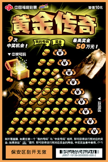 “黄金传奇”彩票面值10元,头奖50万元,奖级10级,返奖率65%,中奖面32.34%。