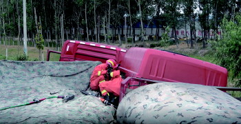 消防救援人员到场后经询问得知,一半挂车在快车道行驶途中向右转弯,与后方前行车辆发生碰撞,导致后车司机被困驾驶室内。