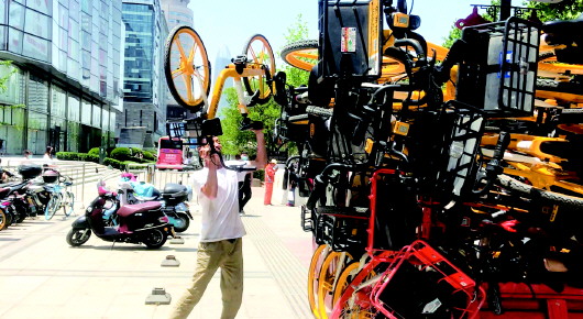 6月3日,共享单车公司工作人员正在清运泉城路上停放的单车。