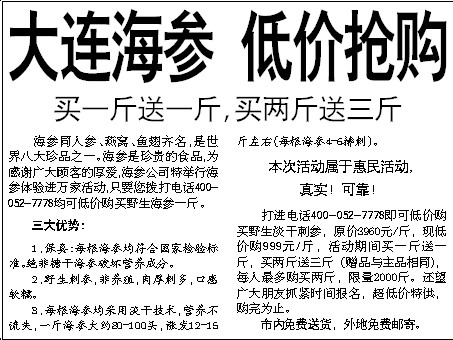 海参同人参、燕窝、鱼翅齐名,是世界八大珍品之一。海参是珍贵的食品为感谢广大顾客的厚爱海参公司特举行海参体验进万家活动只要您拨打电话400-052-7778均可低价购买野生海参一斤。      三大优势:   1、保真:每根海参均符合国家检验标准。绝非糖干海参破坏营养成分。   2、野生刺参,非养殖,肉厚刺多,口感软糯。   3、每根海参均采用淡干技术,营养不流失,一斤海参大约80-100头,涨发12-15斤左右(每根海参4-6排刺)。      本次活动属于惠民活动,   真实!可靠!   打进电话400-052-7778即可低价购买野生淡干刺参,原价3960元/斤,现低价购999元/斤,活动期间买一斤送一斤,买两斤送三斤(赠品与主品相同),每人最多购买两斤,限量2000斤。还望广大朋友抓紧时间报名,超低价特供,购完为止。   市内免费送货,外地免费邮寄。 大连海参 低价抢购 买一斤送一斤,买两斤送三斤