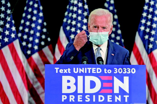 6月5日,美国前副总统拜登在特拉华州多佛摘下口罩准备发表讲话。新华/美联