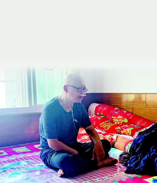 聊天过程中,止疼药渐渐失效,付申虎需要时不时地调整姿势来缓解疼痛。夏季的下午,屋内有些闷热,屋外的制氧机隆隆声不断,付申虎深吸一口气,鼻子上的氧气管不小心脱落,他抚一抚氧气管缓缓说道,“这次去医院检查,发现自己的胸腔已经有了积液,这是病情恶化的表现。“