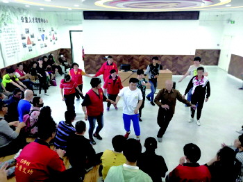 午餐过后,大家走进白手杖公益服务中心演出大厅,敞开心扉,畅聊心声。《最美的歌唱给妈妈》、《我爱你,中国》、《爱的奉献》……一首首声情并茂有关“爱”的歌曲,一阵阵欢乐起伏的笑声,让现场充满温馨与感动。来自四川宜宾、在威海定居16年的64岁盲人朋友龙贻文口琴独奏了一曲《好人一生平安》,借以表达对双举海参的感激之情;70岁的徐涛和石磨艾坊的孩子曲天添动情地唱起了《歌唱祖国》,赢得了经久不息的掌声;83岁的“石磨爷爷”王培金带头和孩子们以及石磨艾坊志愿者们一起在《中国歌最美》歌声中扭起的胶东大秧歌更是把现场活动气氛推向了高潮。