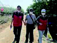 李双举和员工万飞霏牵着盲人徐涛的手一起走进采摘园。