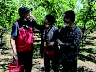 石磨艾坊的残疾青年黄滋琳(中)高兴地将亲手摘下的桑葚送给李双举(左)品尝。