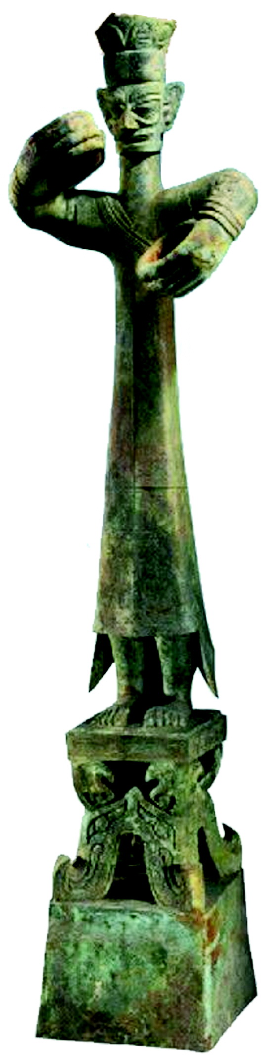 ◥ 三星堆出土文物铜立人像。即便是西方学者站在西方文明的角度来看,三星堆的发现一点也不逊于发现尼尼微和特洛伊古城的意义。