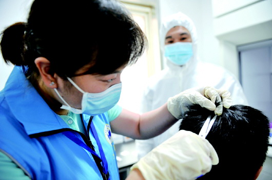 高建华协助民警,对辖区内的吸毒人员进行毛发检测。