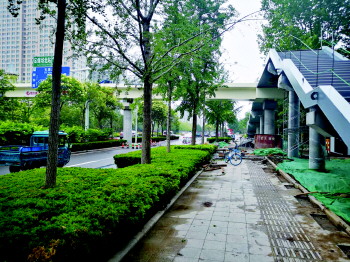 6月29日上午,当记者来到潍坊市区北海路富华巷路口时,此处的过街天桥已经完成了天桥上部主体吊装,一座漂亮的天桥初步呈现在市民面前。北海路桐荫街路口的天桥也已经完成主体桥面吊装,施工人员仍在进行紧张的施工。四处过街天桥除了外观各有特色外,桥体的各项数据指标都一样,天桥主桥净跨64米,桥下净空5米,桥面净宽3.5米,设四部梯道。 齐鲁晚报·齐鲁壹点记者 蔚晓贤 摄影报道
