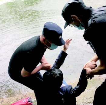 本报6月29日讯(记者 潘旭业) 黄岛一男子雨天坐在人工湖边不慎溺水,6月29日上午,青岛开发区民警接警后雨中跳湖救人,男子被救出时已经昏迷。