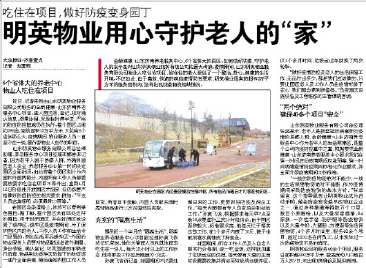 金龄健康·山东济南养老服务中心,6个省体大的园区。如何做好防疫,守护老人的安全是对山东明英物业服务有限公司的最大考验。疫情期间,山东明英物业服务有限公司物业人吃住在项目,给在住的老人提供了一个整洁、舒心、健康的生活环境。不仅如此,由于高效、快速的响应疫情防控要求,明英物业服务的超400万平方米的服务面积内,没有出现防疫物资短缺情况。