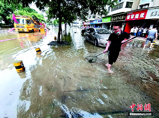 武汉连降暴雨内涝市民马路上捕鱼