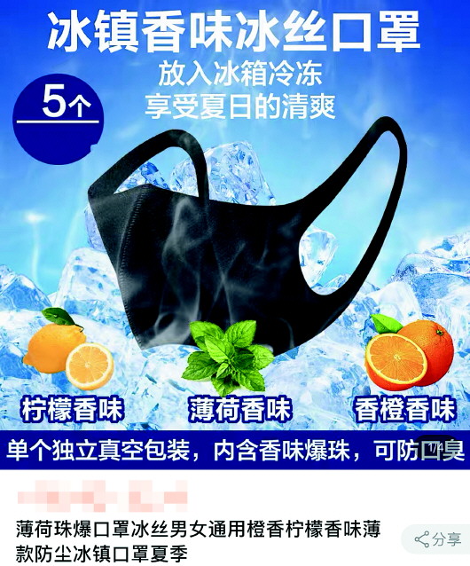 近日,齐鲁晚报·齐鲁壹点记者发现一些网上店铺开始销售“清凉”口罩。一家店铺销售一款名为“冰镇香味冰丝口罩”,宣传称:放入冰箱冷冻,享受夏日的清爽。该口罩的售价为28.3元5个。