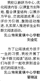 我校以教研为中心,优化阅读内容;以课堂为主阵地,整合课堂结构;以展示为平台,交流阅读成果;以评价为引领,激励活动推进,扎实深入推进学生全科群文阅读活动。 乳山市南黄镇中心学校 刘金花 为了让阅读成为孩子一生的习惯,我校开展了“亲子群文阅读”活动,家长们与孩子一起收获到适合自己的阅读方法。 乳山市南黄镇中心学校 姜晓波