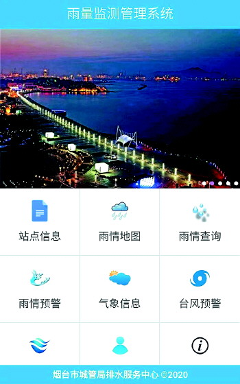 烟台市城管局排水服务中心在套子湾污水处理厂、港站立交桥雨水泵站等14处防汛区域安装了14台自动雨量计,并开发了雨量监测管理系统(手机APP),涵盖了气象信息、雨情查询、雨情地图、雨情预警、台风预警、潮汐信息等多方面内容。市区出现降雨时,自动雨量计会将降雨量信息实时传送到防汛队员手机APP上,当在一定时间内降雨量达到一定数值时,防汛队员会立即收到报警信息。各部门根据各自防汛区域内的实际降雨情况,及时出动防汛队员和机械设备进行应急抢险,有利于大大提高防汛应急反应速度。