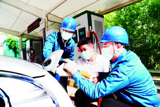 7月1日,枣庄供电公司员工王乐蒙、杨勇在枣庄新城市直机关充电站巡查维护,现场为电动汽车车主提供充电服务。