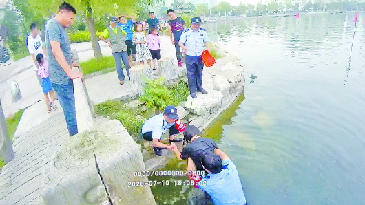 接警后,康电亮、贾长森两位民警迅速出动,沿湖边排查,在荷香亭附近发现落水者。跑在前面的贾长森直接跳进湖里救人。“下水后发现水太深,根本够不到底。”贾长森说,他一手抓住落水女孩,一手奋力划水,尽力往岸边游。他的同事康电亮随后赶到现场,“幸好附近一位市民带着一根长竿,借助这支长竿,我把水中的两人拉到了坡缓的地方。”康电亮说。