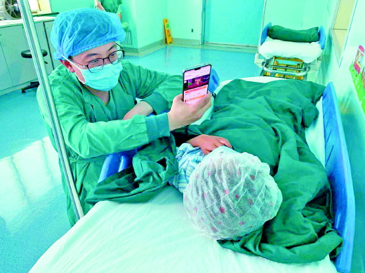 手术室内,医生举着手机播放动画片为孩子缓解紧张情绪。