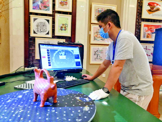 山东博物馆工作人员对一件文物复制品进行扫描。