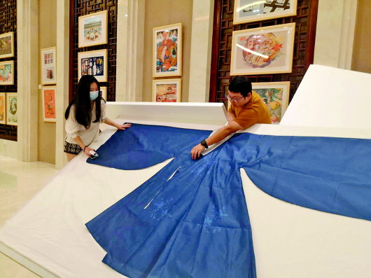 拍摄角度也进行了反复尝试。阮浩介绍,过去拍摄服饰文物,都是直接挂在墙上,但是因为受地心引力影响,服饰的裙摆会下垂收缩,没法展示全貌。如果平铺在地面上,摄影师拍摄角度又很难把握,而且如何布光也是问题。“最后,我们定制了三十度角的斜坡式拍摄台,摄影师在几米之外的升降台上作业,这样能达到最佳效果。”