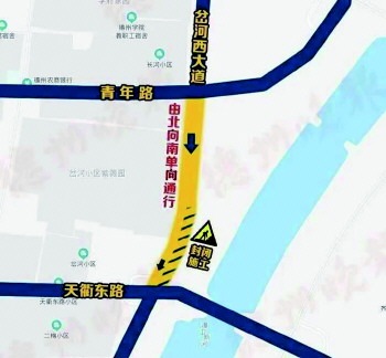 施工期间,青年路至天衢路北侧匝道实行机动车由北向南单向通行,非机动车双向通行。