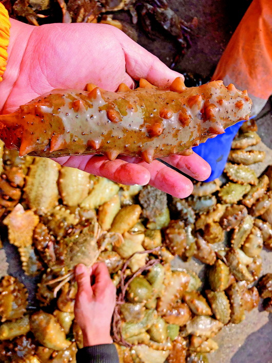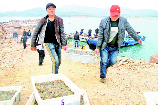 4月,春参捕捞季时,长岛大钦岛渔民捕捞底播海参。