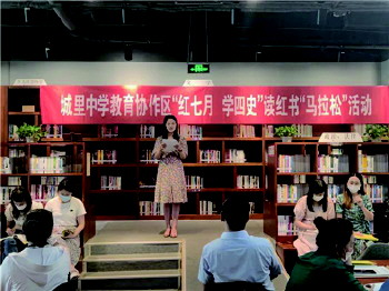 红书“马拉松” 为纪念中国共产党成立99周年,进一步激发党员学习和工作活力,近日,城里中学教育协作区在威高城市书房举行“红七月 读四史”读红书“马拉松”活动。(赵一蔚)