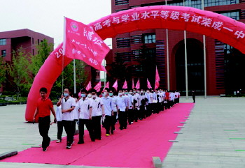 出征 7月6日,荣成一中高三学子迈着整齐的步伐踏过“龙门”,奔赴高考考场。(龙玉芳)