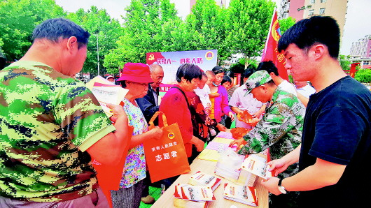 居民积极领取人防宣传材料,学习人防知识。