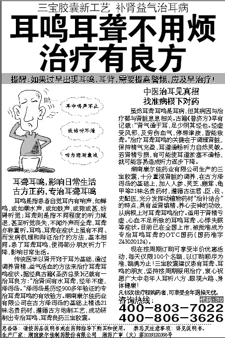 耳聋耳鸣,影响日常生活   古方正药,专治耳聋耳鸣   耳鸣是指患者自觉耳内有响声,如蝉鸣,或如潮水声,或如鼓声,或微或甚,妨碍听觉;耳聋则是指不同程度的听力减退,甚至听觉丧失,不闻外声而全聋,耳聋亦称重听。耳鸣、耳聋在症状上虽有不同、而发病机理和辩证治疗的方法,基本相同。患了耳聋耳鸣,使得部分朋友听力下降,影响日常生活。   传统医学以肾开窍于耳为基础,通过调养肾精、益气活血的方法来治疗耳聋耳鸣症状。据经典古籍《圣济总录》记载有一治耳良方:“治肾间有水耳聋,经年不瘥,泽泻汤。”泽泻汤是历经900多年验证的专治耳聋耳鸣的有效验方。湖南康尔佳药业有限公司在古方泽泻汤的基础上精选21味名贵药材,遵循古方炮制工艺,成功研制出专治耳鸣、耳聋良药三宝胶囊。      中医治耳见真招   找准病根下对药   虽然耳聋耳鸣是耳病,但其病因与治疗都与肾脏息息相关。古籍《普济方》早有记载:“肾气通于耳,足少阴其经也。经虚受风邪,及劳伤血气,停滞津液,皆能致聋。”治疗耳聋耳鸣的关键在于调理肾脏,保持精气充盈,耳道通畅听力自然灵敏。若肾精亏损,有可能使耳道淤塞不通畅,就可能容易造成听力逐步下降。   湖南康尔佳药业有限公司生产的三宝胶囊,十分重视肾脏的调养,在古方泽泻汤的基础上,加入人参、灵芝、鹿茸、龟甲等21味名贵药材,遵循古法君、臣、佐、史配伍,充分发挥动植物药材“治补结合”的特点,具有益肾填精、养心安神的功效,从病根上对耳聋耳鸣治疗。适用于肾精亏虚、心血不足所致的耳鸣耳聋、心悸失眠等症状。目前已在全国上市,被批准成为专治耳鸣耳聋的OTC国药(国药准字Z43020124)。   现在按周期订购可享受半价优惠活动,每天仅限100个名额,以订购顺序为准,额满为止!三宝胶囊建议患有耳聋、耳鸣的朋友,坚持按周期服用治疗,衷心祝愿广大中老年人耳听八方、眼观六路、身体健康!   凡初次按疗程购药者,可享受全年退换无忧。 三宝胶囊新工艺 补肾益气治耳病 耳鸣耳聋不用烦 治疗有良方 提醒:如果过早出现耳鸣、耳背,需要提高警惕,应及早治疗! 代码:310 咨询热线: 400-803-7022 400-806-3626 忠告语:请按药品说明书或在药师指导下购买和使用。 禁忌及注意事项:详见说明书。 生产厂家:湖南康尔佳制药股份有限公司 湘药广审(文)第2019120366号