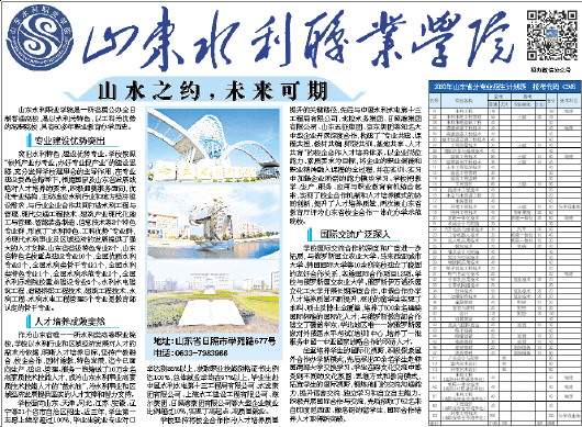 山东水利职业学院是一所省属公办全日制普通高校,是以水利为特色,以工科为优势的高职院校,具有60多年职业教育办学历史。      专业建设优势突出   突出水利特色,建设优势专业。学校按照“依托产业办专业,办好专业促产业”的建设思路,充分发挥学校理事会的主导作用,在专业建设委员会指导下,根据国家及山东省发展战略对人才培养的要求,积极调整服务面向,优化专业结构,主动适应水利行业和地方经济建设需求,与行业企业合作共同打造水利工程与管理、现代交通工程技术、建筑产业现代化施工与管理、智能装备制造、信息技术等8个特色专业群,形成了“水利特色、工科优势”专业群,为现代水利事业及区域经济的发展提供了强大的人才支撑。山东省省级特色专业8个,山东省特色名校重点建设专业10个,全国优质水利专业3个,全国水利类骨干专业1个,全国水利类特色专业1个,全国水利示范专业2个,全国水利示范院校重点建设专业6个。水利水电建筑工程、道路桥梁工程技术、建筑工程技术、水利工程、水利水电工程管理5个专业是教育部认定的骨干专业。      人才培养成效斐然   作为山东省唯一一所水利类高等职业院校,学校以水利行业和区域经济发展对人才的需求为依据,明晰人才培养目标,坚持产教融合,校企合作,因材施教,特色发展,迄今已面向生产、建设、管理、服务一线输送了10万余名高素质技术技能人才,成为山东水利事业高素质技术技能人才的“蓄水池”,为水利事业和区域经济发展提供坚实的人才支撑和智力支持。   学校面向山东、天津、河北、江苏、安徽、辽宁等21个省市自治区招生。近三年,学生第一志愿上线率超过100%,毕业生就业专业对口率达到86%以上,获取职业技能资格证书比例达100%,总体就业率均在97%以上,毕业生赴中国水利水电第十三工程局有限公司、水发集团有限公司、上海水工建设工程有限公司、海尔集团、日照港集团有限公司等大型企业就业比例超过10%,实现了高起点、高质量就业。   学校坚持将校企合作作为人才培养质量提升的关键路径,先后与中国水利水电第十三工程局有限公司、北控水务集团、日照港集团有限公司、山东五征集团、京东集团等知名大中型企业开展深度合作,构建了“专业共建、课程共担、教材共编、师资共训、基地共享、人才共育”的校企合作人才培养体系。以企业岗位能力、素质要求为目标,将企业的职业道德和职业精神融入课程的全过程,并在实训、实习中加强企业所需的能力模块学习。学校把教学、生产、服务、应用与职业教育有机结合起来,实现了校企合作机制和人才培养模式的协同创新,提升了人才培养质量,两次被山东省教育厅评为山东省校企合作一体化办学示范院校。      国际交流广泛深入   学校国际交流合作的深度和广度进一步拓展,与俄罗斯国立农业大学、马来西亚城市大学、韩国国际大学等10余所高校建立了稳固的友好合作关系,实施国际合作项目12项。学校与俄罗斯国立农业大学、俄罗斯伊万诺沃国立化工大学开展长期深度合作,中俄合作办学人才培养质量不断提升,派出的留学生实现了本科、硕士及博士全覆盖,培养了500余名通晓国际标准的国际化人才;与俄罗斯教育部合作建立了覆盖华东、华北地区唯一一家俄罗斯国家对外俄语水平考试(培训)中心,培养了一批服务中国—中亚国家战略合作的双语人才。   注重培养学生的国际化视野,积极探索国外合作办学新模式,先后派出30余名学生赴韩国南部大学交换学习。学生在跨文化交流中感受到不同的文化氛围、思维方式和教育模式,拓宽学生的国际视野,锻炼他们的交流沟通能力,提升语言交流、独立学习和自立自主能力。积极开展国际合作与交流,先后招收了52名来自印度尼西亚、摩洛哥的留学生,国际合作培养人才取得新突破。    山水之约,未来可期   招办微信公众号   2020年山东省分专业招生计划表 报考代码 C946 2020年山东省分专业招生计划表 2020年山东省分专业招生计划表 2020年山东省分专业招生计划表 2020年山东省分专业招生计划表 2020年山东省分专业招生计划表 2020年山东省分专业招生计划表 2020年山东省分专业招生计划表   报考代码 C946   代号 专业名称 夏考 春考 合计 选考科目 选考科目 选考科目   普通 艺术 专业类别 计划     01 水利工程 160       160 物理   02 水利水电工程管理 59   土建 20 79     03 水利水电建筑工程 40       40     04 道路桥梁工程技术 40       40 物理   05 高速铁道工程技术 40       40     06 城市轨道交通工程技术 40       40     07 工程测量技术 30   土建 10 40     08 摄影测量与遥感技术 40       40     09 建筑工程技术 80   土建 10 90 物理   10 建筑装饰工程技术 30   土建 10 40     11 土木工程检测技术 40       40     12 建设工程管理 30       30     13 建设工程监理 30       30     14 工程造价 80   土建 10 90     15 给排水工程技术 20       20     16 水文与水资源工程 20       20     17 水务管理 40       40     18 环境工程技术 50   土建 10 60 化学或生物   19 园林工程技术 40   农林果蔬 20 60     20 机电一体化技术 40   机电一体化 20 60 物理   21 机械设计与制造 30       30     22 汽车检测与维修技术 30   汽车 20 50     23 工业机器人技术 30   机电一体化 10 40     24 无人机应用技术 20   机电一体化 10 30     25 数控技术 20   