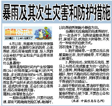 暴雨是指短时间内产生较强降雨(24小时降雨量≥50毫米)的天气现象,多出现在每年的4-9月。暴雨是我国主要气象灾害之一,长时间的暴雨容易产生积水或径流淹没低洼地段,造成洪涝灾害,还会引发山体滑坡、泥石流等地质灾害。