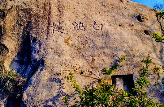 “白鹤楼”三个大字,便刻在一方巨石上。这是一块长方形平整的磐石,长约两丈,宽约一丈余。相传当年这上面就矗立着一座洁白的玉楼,那就是“白鹤楼”。巨石东侧,竖刻“白鹤楼”三个楷体字,长宽四十厘米,上款已剥蚀,下款书“熙宁九年九月”,以后字迹已无法辨认。