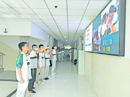 在济南三中领秀校区,高一学部一楼大厅里的大屏每每成为学生们关注的焦点。哪位同学良好的学习计划上屏了?哪个班级认真上课的照片又上屏了……随时变化的大屏总能成为学生们的话题。