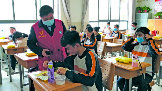 复课后,校长邵晋波走进教室了解学生就餐情况。