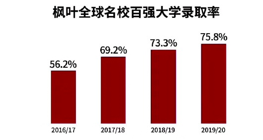创立至今,枫叶教育集团已培养1万6千余名毕业生从枫叶走向世界,被全球30个国家和地区的707所高校录取,包括美国斯坦福大学、芝加哥大学,英国剑桥大学、帝国理工大学、伦敦大学学院,加拿大多伦多大学,澳大利亚国立大学,新加坡国立大学等。2020年6月,超过75%的毕业生被枫叶全球百强名校录取。