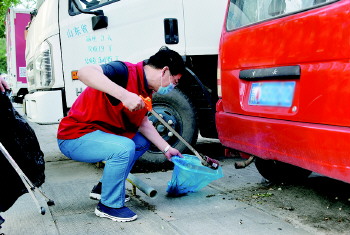 在街道两旁,队员们带着掃把、垃圾袋、垃圾夹等清洁工具,对路面及人行道、绿化带、 花坛、树丛下的垃圾、杂物、烟头进行清理。