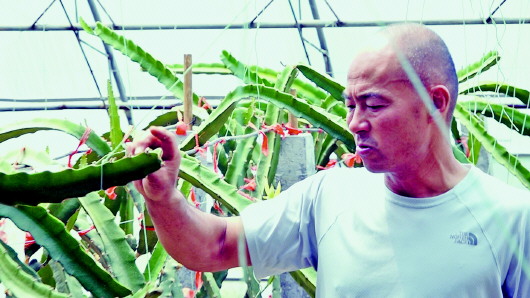 吴勇在巨野县太平镇的农业产业园里进行火龙果苗的修剪。