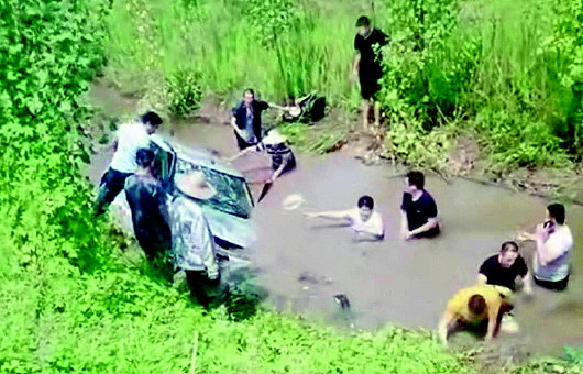 王金杰尝试从车门救人,但水深到其胸口,多次摸索没能成功。幸好朋友喊来了多位路人和过路车的驾驶员,“喊来七八个人”,大家一起下水把倒扣在水中的事故车掀起扶正,将被困的驾驶员救了出来(上图)。所幸该驾驶员只是呛了几口水,并无大碍。