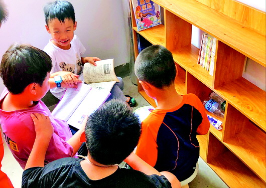 韩家小区“书香楼道”里,孩子们在一起阅读书籍。