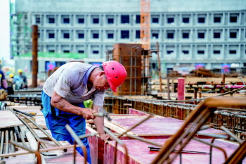 航运路康养中心项目现场,工人正在安装模板。